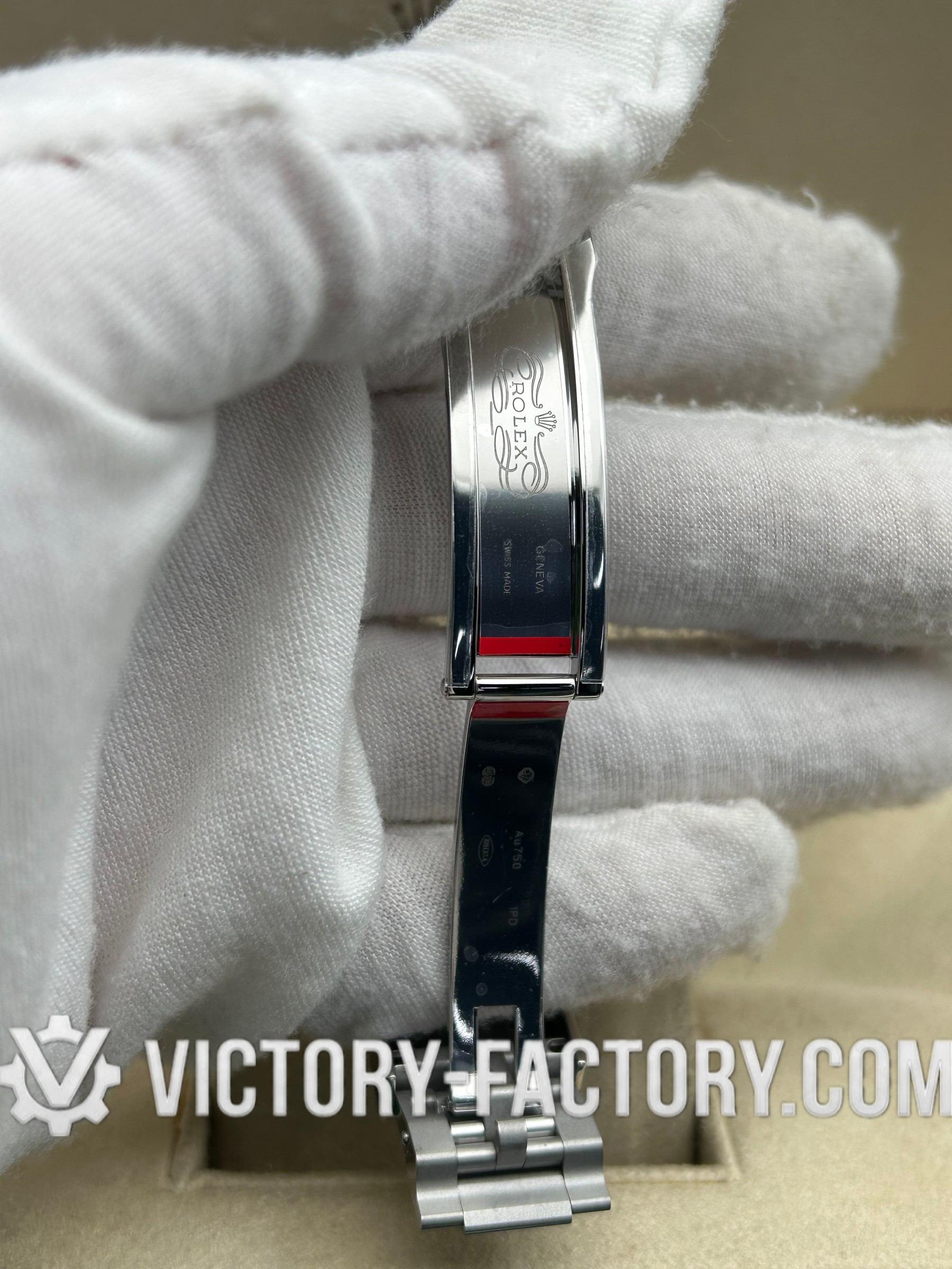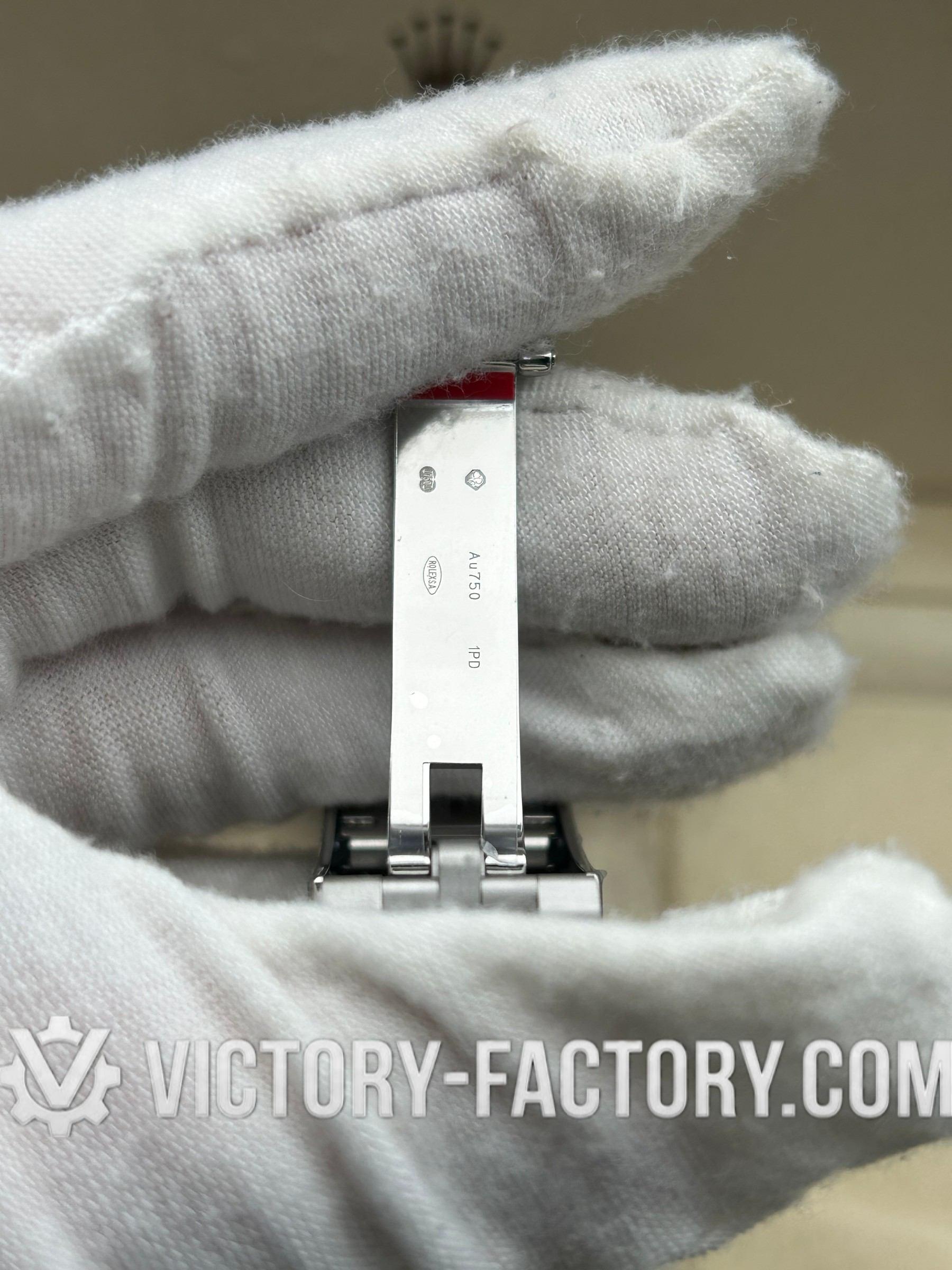 The folding Oyster safety clasp is crafted from 18k White Gold wrapped solid 904L stainless steel, secured by a DLC scratch-protection coating.